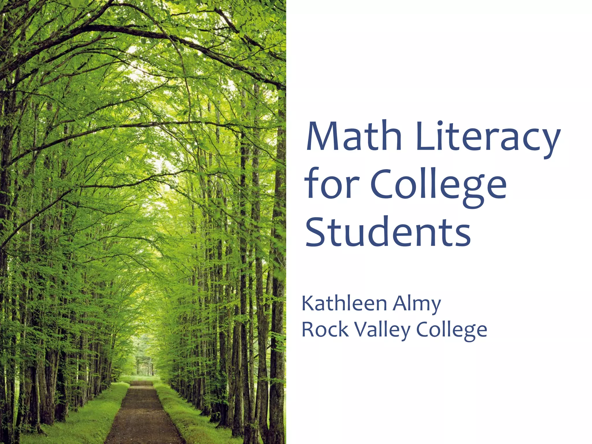 This document discusses math literacy pathways for college students, including the Math Literacy for College Students (MLCS) course. It provides an overview of the history and goals of developmental math pathways, which aim to better prepare students for non-STEM courses through contextualized learning focusing on critical thinking over deficiencies. The MLCS course covers integrated and layered math topics across one semester to give students the mathematical maturity for statistics and liberal arts math. Early outcomes indicate 60-70% pass rates for MLCS and no significant differences in subsequent gen ed math courses based on taking algebra or MLCS. The document discusses challenges and options for implementing MLCS to replace or augment traditional sequences.