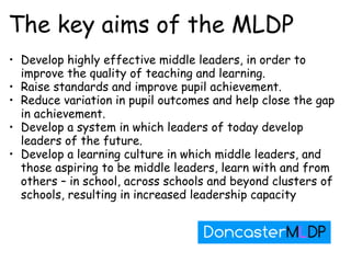The document outlines the expectations and responsibilities of coaches in the Middle Leadership Development Programme (MLDP). The key aims of the MLDP are to develop effective middle leaders to improve teaching quality and raise student achievement. Coaches are expected to support participants through each stage of the programme by meeting regularly, reviewing progress on leadership challenges, and using coaching skills like active listening and questioning to facilitate reflection. Coaches will receive ongoing support and training from the MLDP organizers to best support their participants' leadership development goals.