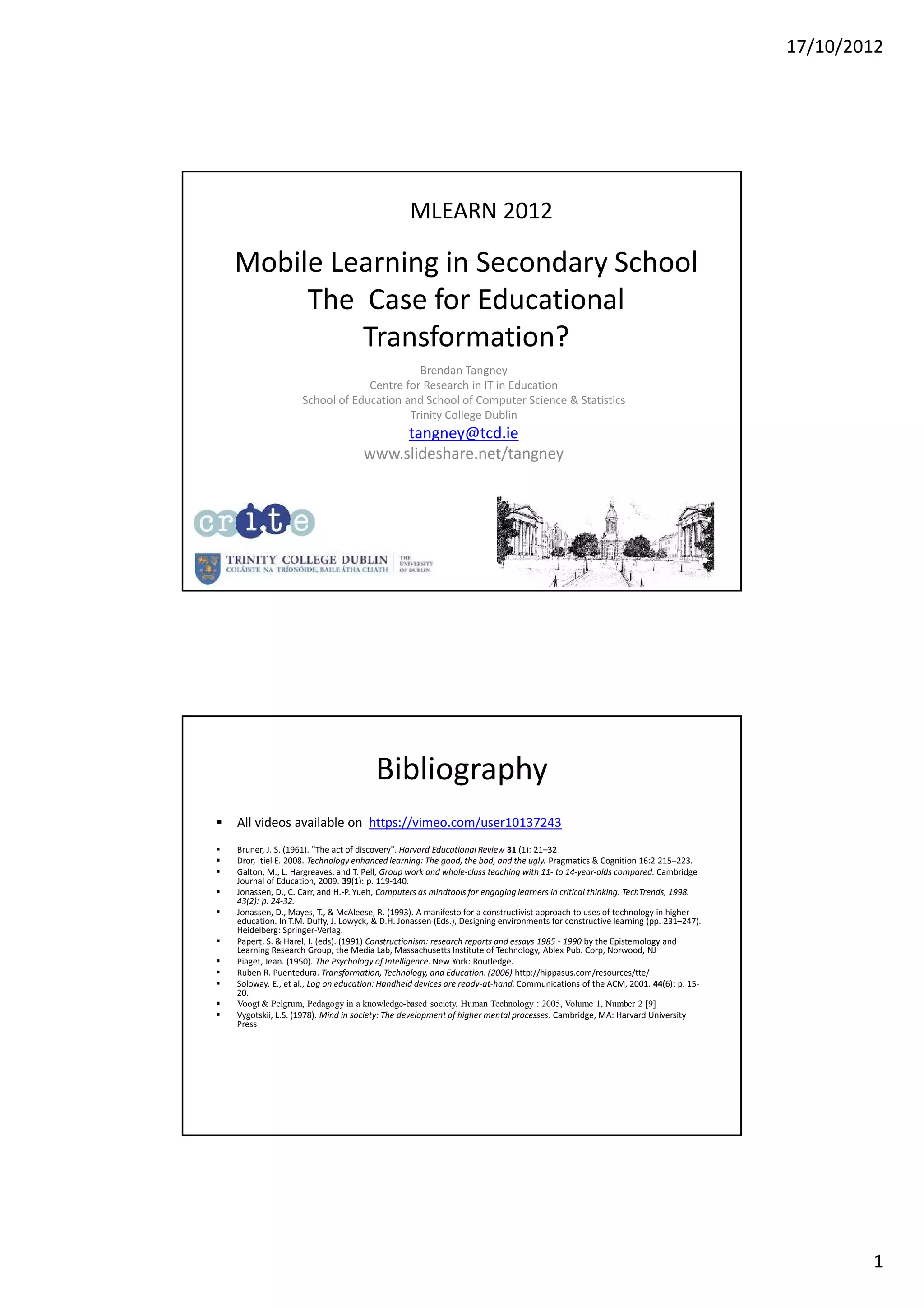 A document summarizes Brendan Tangney's presentation on mobile learning in secondary schools. The presentation discusses constructing learning through interactions with others using mobile technologies. It provides examples of early mobile learning applications that supported collaborative learning conversations and musical collaboration through a virtual drumming application.
