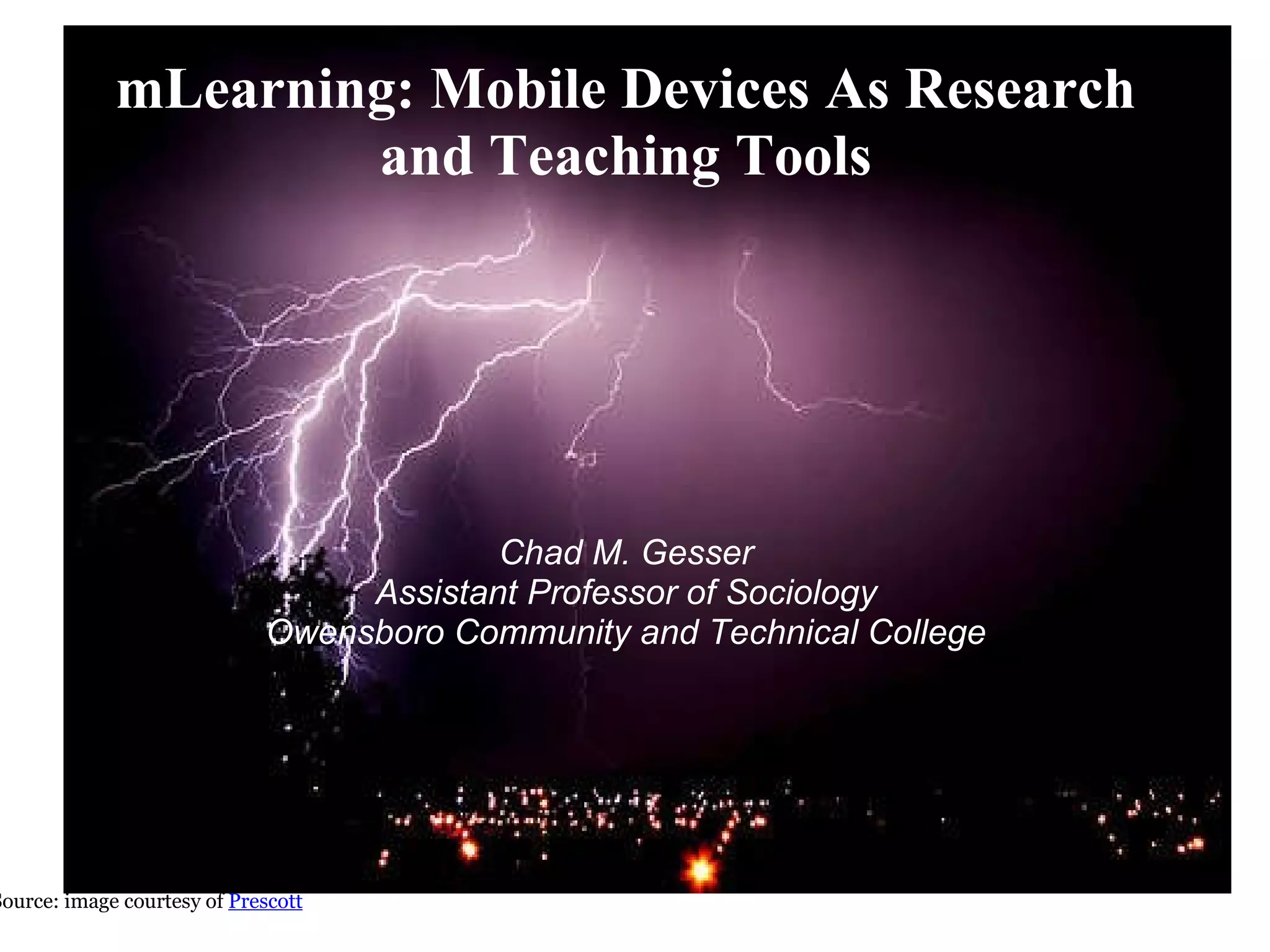 Chad M. Gesser, an assistant professor of sociology, discusses the integration of mobile learning (mlearning) and the use of mobile devices as educational tools in his sociology courses. He shares his teaching experiences, interests in web 2.0 applications, and student feedback on the use of platforms like Facebook for class updates. The document highlights the potential benefits and challenges of adopting mobile technology for enhancing student engagement and learning outcomes.