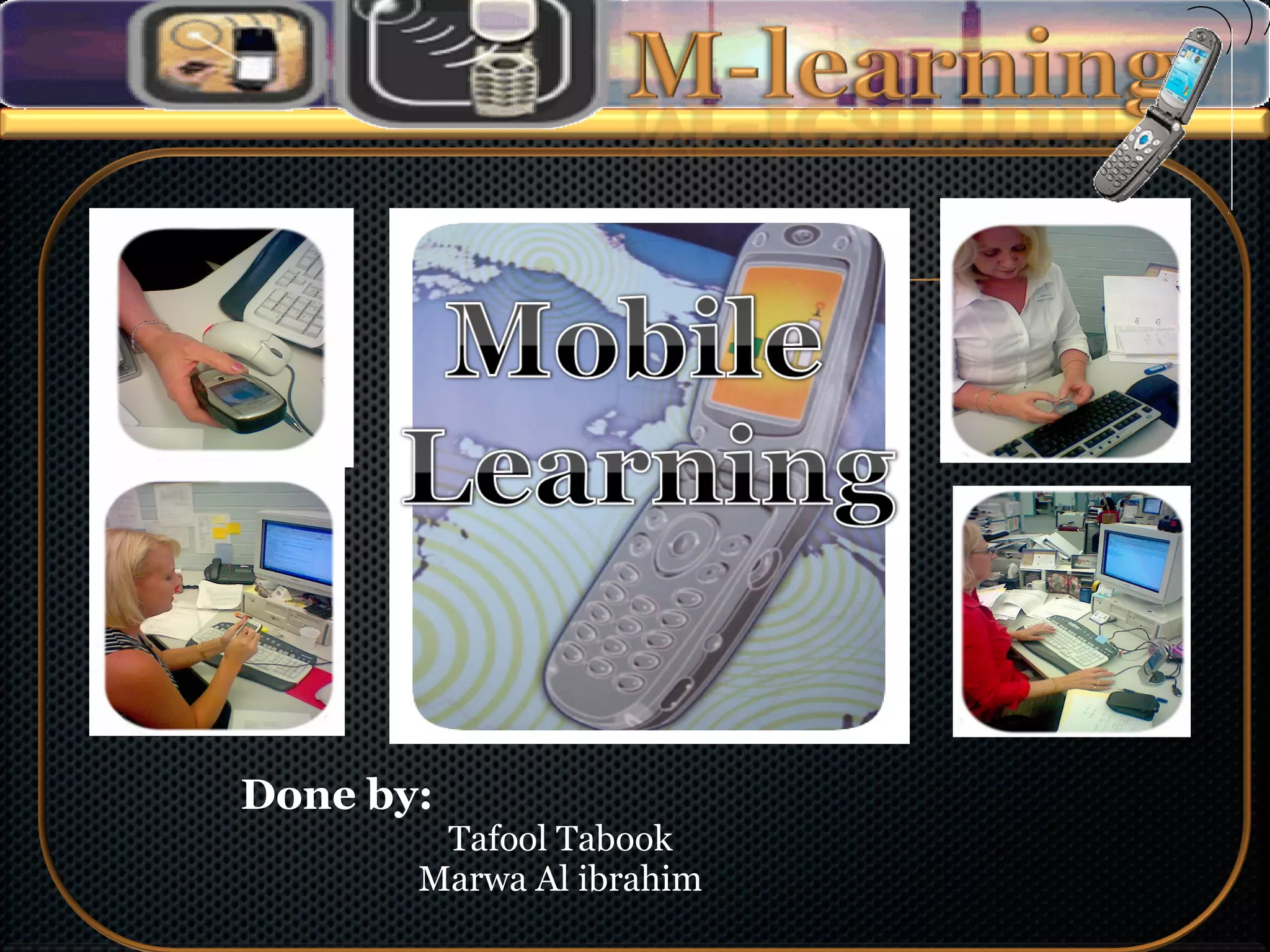 M-learning uses mobile technologies like mobile phones, PDAs, and pocket PCs to enhance learning experiences anywhere and anytime. It allows for collaboration between learners and sharing of assignments. Key benefits include engaging learners through increased access and interaction on portable devices. However, limitations include small screen sizes, network speeds, interactivity, and memory constraints of mobile devices.