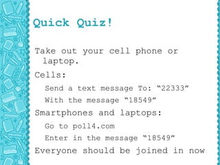 The document discusses using cell phones and mobile devices for educational purposes in the classroom. It describes several interactive activities using cell phones, such as students taking quizzes and polls on their phones. The presentation provides examples of using text messaging and multimedia messaging to engage students and provide feedback. It also discusses the benefits of mobile learning, such as assessing students' knowledge in a more engaging way and using tools that students already use regularly.