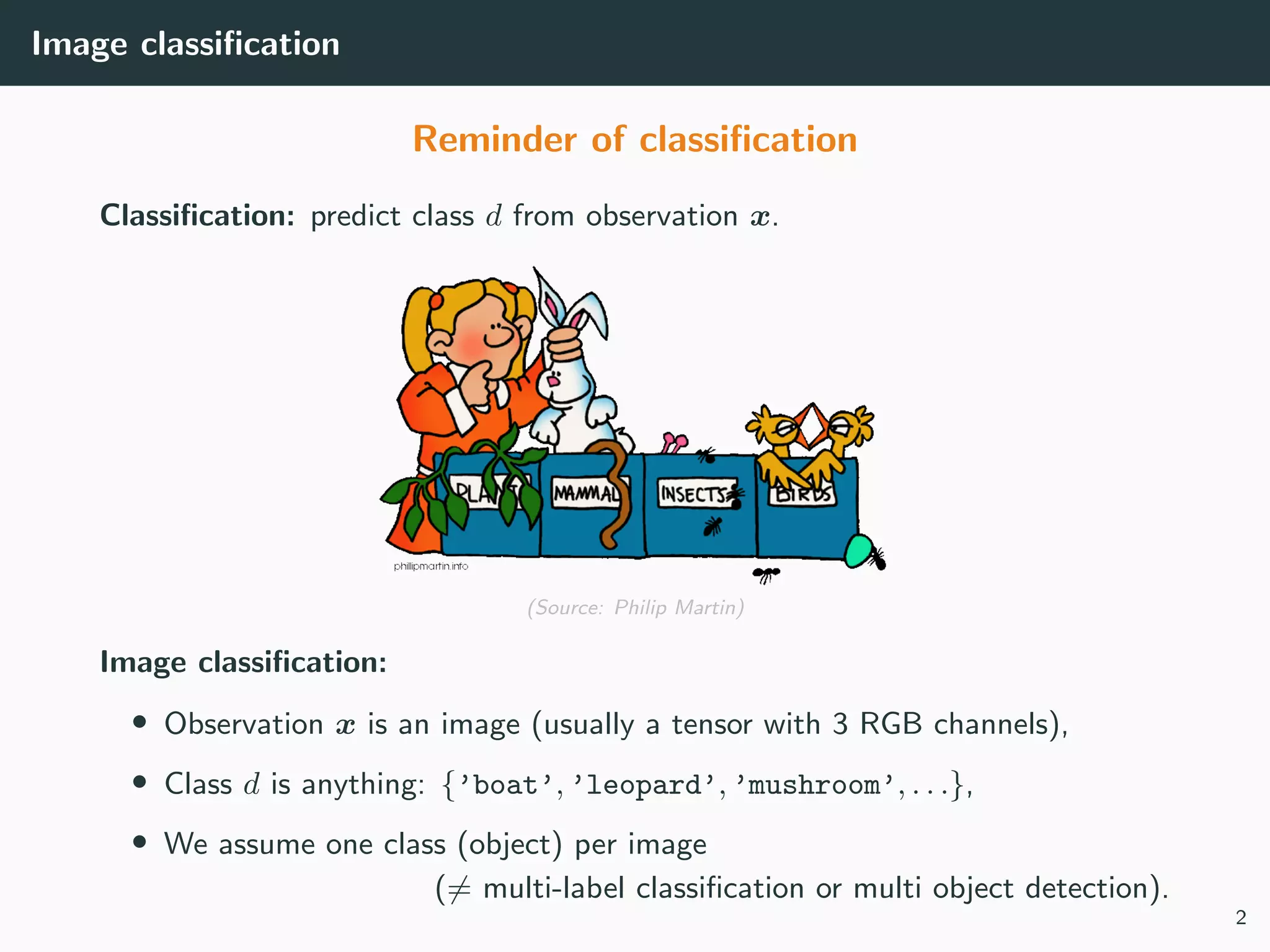 The document discusses image classification in machine learning, specifically focusing on Convolutional Neural Networks (CNNs) and their architecture. It covers key concepts such as image representation as tensors, the importance of convolutional layers, and the need for translation invariance in image processing. Additionally, it explains various techniques and regularizations necessary for effective network design and performance.