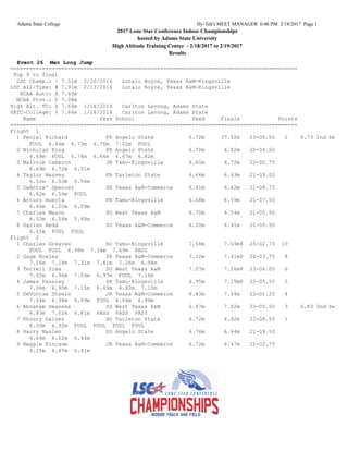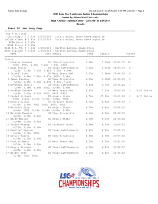 The document summarizes the results of the men's long jump event at the 2017 Lone Star Conference Indoor Championships hosted at the High Altitude Training Center from February 18-19, 2017. Charles Greaves from Texas A&M-Kingsville won the event with a jump of 7.69 meters. The top nine athletes advanced to the finals. Texas A&M-Commerce led the team rankings after three events with 39 points, followed by Texas A&M-Kingsville with 28 points.