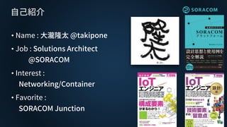大瀧隆太 @takipone • Job : Solutions Architect @SORACOM • Interest : Networking/Container • Favorite : SORACOM Junction 自己紹介