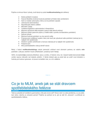 Trump tam popisuje 10 kroků, které mu pomáhají být úspěšným člověkem každý den. Protože Donald Trump je podnikatel, který má k multilevelmarketingu velice blízko (před pár lety založil vlastní MLM společnost – Trump Network), byla by škoda, kdybych se s vámi o tyto žhavé tipy nepodělil. Věřím, že jejich praktikováním se může doslova každý stát úspěšným člověkem ve svém oboru.<br />10 kroků k úspěchu podle Donalda Trumpa<br />1. Buď zaměřen. Dávej všechno, co máš, do toho, co děláš každý den.<br />2. Věř v sebe sama. Pokud nebudeš, nikdo jiný, to za tebe neudělá.<br />3. Buď houževnatý.<br />4. Věr svým instinktům.<br />5. Udržuj si své momentum a veď neustále každého kupředu.<br />6. Dívej se na sebe jako na vítěze a leadera vítězného týmu.<br />7. Buď vášnivý v tom, co děláš.<br />8. Žij na hraně. Nikdy neusni na vavřínech.<br />9. Leadership není skupinové úsilí. Pokud ho máš na starosti, pak je to jen tvá starost.<br />10. Nikdy se nevzdávej!<br />Ekonomická krize? Nejlepší doba pro nastartování osobního byznysu a podnikání! <br />Od ledna nás čeká další nárůst životních nákladů. Už dnes má ale téměř 70 procent českých domácností značný problém vyjít se svými příjmy. Co má dělat ten, koho kladivo krize dostane? Nežehrat na osud a začít podnikat, radí expert na MLM!<br />Víte, kterému druhu podnikání se v těchto nelehkých časech daří nejvíc? Multilevel marketingu! MLM, neboli network marketing, se stává fenoménem dnešní doby. Nevyžaduje totiž téměř žádné vstupní investice ani speciální vzdělání, a přitom jde o velmi efektivní způsob podnikání a vydělávání peněz. „V téměř žádné jiné branži člověk nestoupá po kariérním a finančním žebříčku tak rychle, jako v MLM. Ovšem za předpokladů, že si vybere pro sebe opravdu dobrou MLM společnost s dobrým produktem, je ochoten se tento druh obchodu „za pochodu naučit“ a svůj úspěch v něm si odpracovat. Čím dál víc lidí, a to i špičkových manažerů, vyhledává dobré MLM společnosti, aby zabezpečili sebe a své rodiny. A řada z nich se v relativně krátké době skutečně propracuje k finanční nezávislosti.<br />„Nastartovat osobní byznys v zavedené MLM společnosti se dá i při jakémkoli zaměstnání,“ říká Pilný. „Chce to ale správně si ji zvolit a nemít nereálná očekávání. Kdo není ochoten se namáhat, ať to ani nezkouší. Mám zkušenost, že ten, kdo pořádně pochopí, o jak úžasnou příležitost se jedná, toho network chytí natolik, že se mu začne věnovat naplno. Výsledky jsou totiž vidět dost brzo.“<br />Největší problémy jsou tedy dva: osobní rozhodnutí a správný výběr produktu a společnosti. Zadáte-li do Googlu heslo „MLM společnosti“, vyjde vám víc než 300 000 odkazů. V takového záplavě informací se laik vyzná stěží. Oddělit zrno od plev a dobře poradit umí jen odborník.<br />Fenomén MLM <br /> <br />CO ŘÍKÁ WIKIPEDIE / CO ŘÍKAJÍ ODBORNÍCI / MLM JAKO OSOBNÍ BYZNYS<br /> <br /> <br />Co říká Wikipedie:<br /> <br />Multi-level marketing (zkráceně MLM), nazývaný též síťový marketing, je forma přímého prodeje. Jeho podstatou je zkrácení distribučního řetězce na minimum. Výrobce nebo dodavatel služeb vytvoří podmínky pro samostatné podnikání nezávislých přímých prodejců. Tak vzniká mnohovrstevní (multi-level) struktura (síť) prodeje, která je účinnější a levnější než klasický distribuční řetězec velkoskladů a velkoobchodů. Zjednodušeně lze říct, že jde o jakousi kombinaci přímého prodeje a frenčízingu.<br />Jako první využila MLM firma California Vitamins roku 1940 v USA. Později tento způsob přímého prodeje převzala také firma Amway (1959), která se v roce 1979 zasadila o definici legální podoby MLM. Definice se pak stala v mnohých státech základem pro vymezení podmínek tohoto obchodního systému zákonem.<br />Seriózní firmy, využívající MLM, jsou sdružené v mezinárodních asociacích FEDSA nebo WFDSA a také v národní asociaci AOP. Členové asociace se zavazují přijetím členství k vysoké kvalitě svého zboží a služeb a stejně tak se zavazují k normám etického chování.<br />Pyramidové schéma (označované také jako pyramidová hra nebo letadlo) je dlouhodobě neudržitelný a podvodný model, který slibuje výdělek především za získávání dalších účastníků. Každý nový účastník musí za vstup do schématu zaplatit poplatek a za to dostává právo vybírat tento poplatek od dalších…. Část vybraného poplatku si nechává pro sebe a část odevzdává tomu, kdo jej získal. Pyramidové schéma nenabízí žádný dodatečný kvalitní produkt ani službu. Tento obchodní model je nelegální a v praxi nemůže dlouho fungovat.<br /> <br />Podobnost s multi-level marketingem<br /> <br />Existují podobné obchodní modely, pro laika často zaměnitelné. Nejznámější z nich je multi-level marketing (MLM). Tyto modely jsou legální a udržitelné. Mezi pyramidovým schématem a MLM je ale poměrně široká šedá zóna. Mnoho pyramidových schémat využívá těžké rozlišitelnosti nebo lehké zaměnitelnosti s legálními obchodními modely. Základním rozlišovacím znakem je fakt, že osoba za nějaký vstupní poplatek dostává příslib exponenciálně rostoucího příjmu, jako odměnu za získání dalších účastníků schématu. Za poplatek dostane osoba možnost nabízet stejný příslib jiným. V pyramidových schématech je součástí každého vstupního příspěvku i odměna původnímu prodejci.<br />Základní charakteristika každého pyramidového systému je fakt, že peníze jednoduše plynou vzhůru od posledního článku řetězce směrem k zakládají