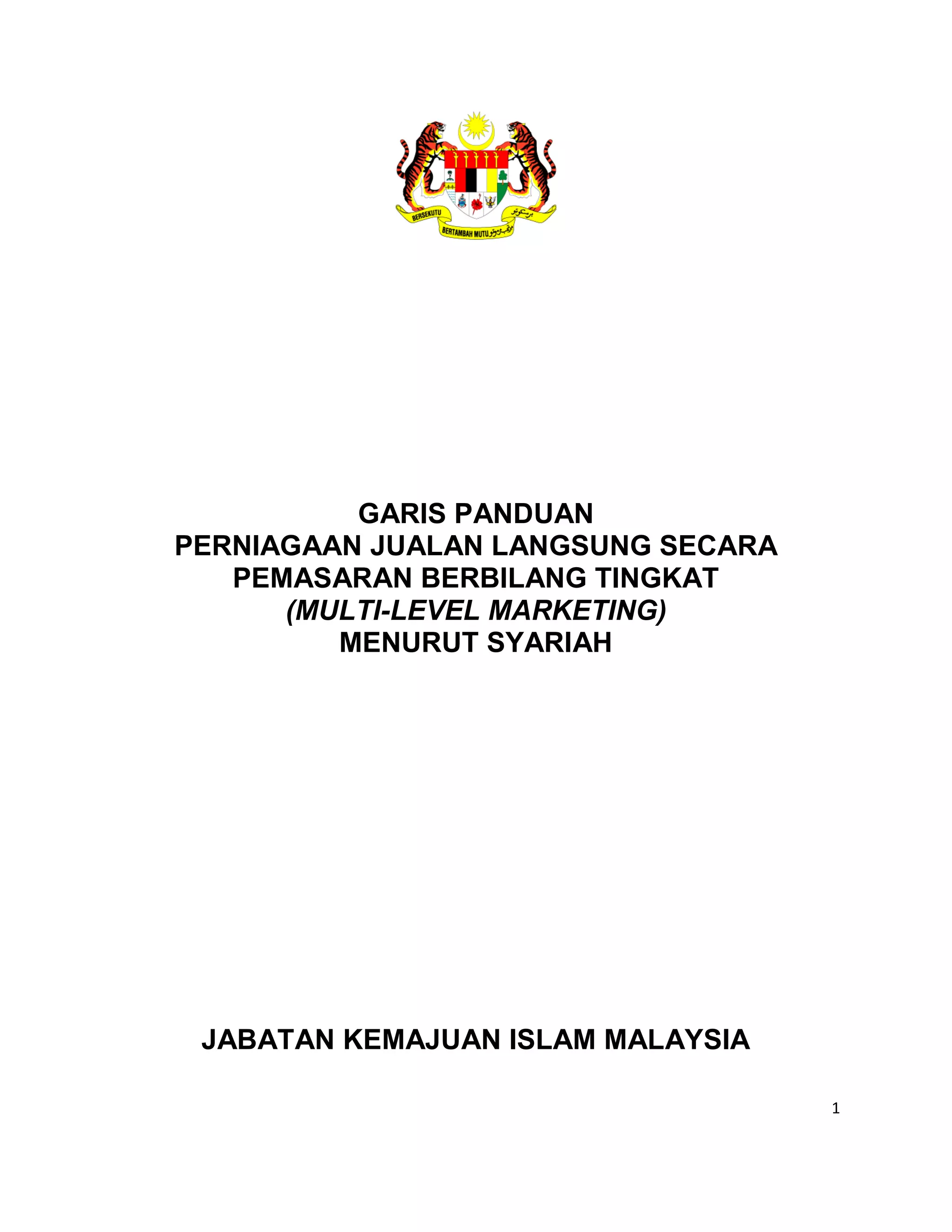 Dokumen ini adalah garis panduan mengenai perniagaan jualan langsung secara pemasaran berbilang tingkat (MLM) menurut syariah, bertujuan untuk memberikan panduan kepada pelbagai pihak yang terlibat bagi memastikan amalan ini mematuhi prinsip syariah. Garis panduan ini telah disediakan oleh jawatankuasa pakar dan diluluskan oleh muzakarah jawatankuasa fatwa, menetapkan kriteria dan amalan yang diharuskan dalam MLM, termasuk keperluan kontrak dan hak peserta. Terdapat juga definisi terperinci mengenai istilah penting serta jenis pelan pemasaran yang dibenarkan dalam perniagaan ini.