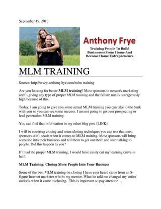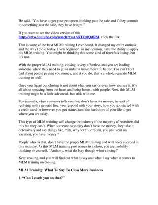 The document provides MLM training on closing techniques. It discusses how most MLM sponsors do not provide proper training, leading to high failure rates. It then offers advice on closing techniques, including getting prospects to commit to something beyond the initial sale, addressing objections with personal stories, and suggested questions to ask prospects before they join. Specific closing lines and responses to common objections are presented as part of the MLM training.