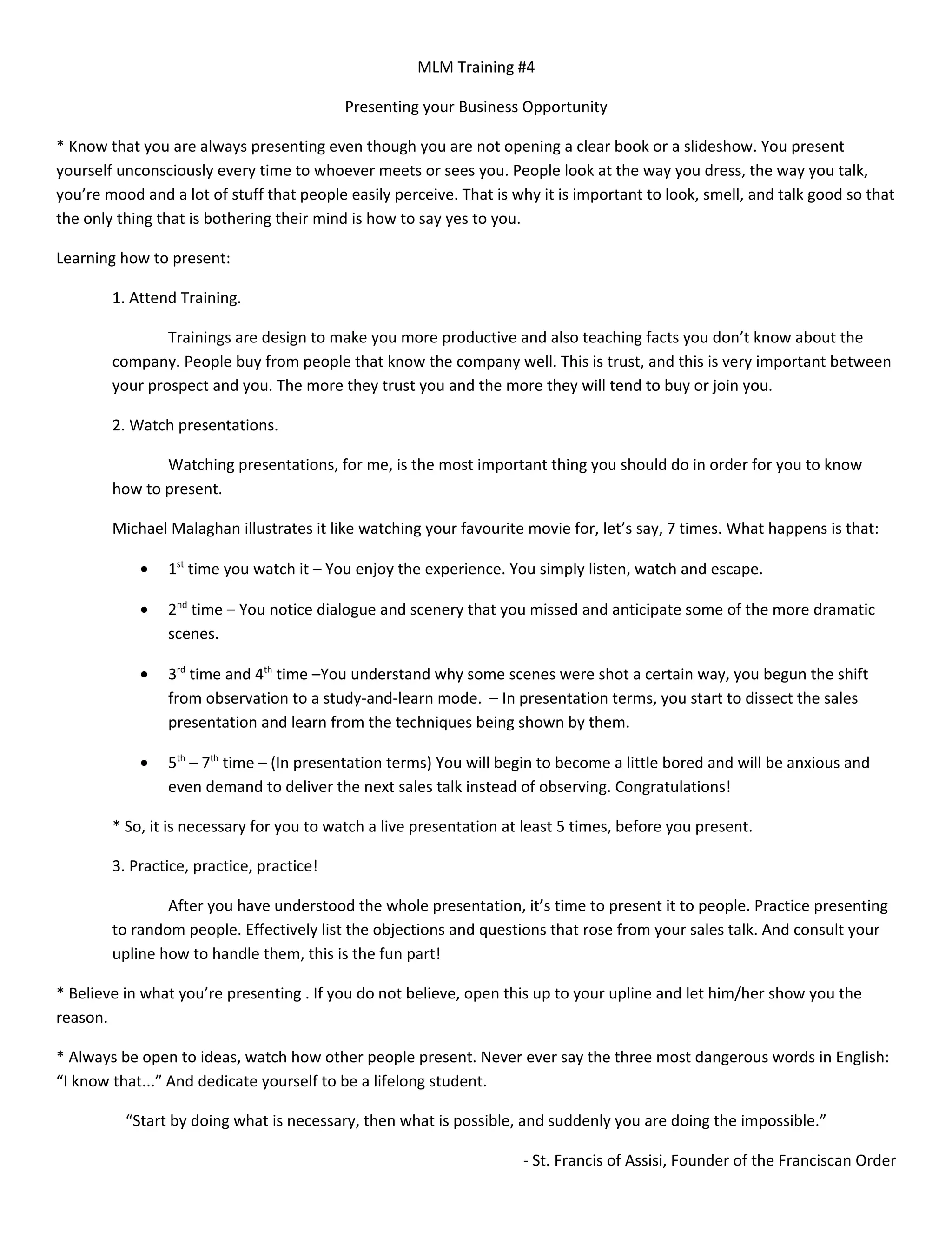 1) It is important to always be presenting your MLM business opportunity through your appearance, demeanor, and communication with others. People will judge you and be more receptive based on first impressions.