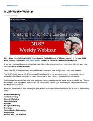 The document promotes the MLSP weekly webinar as a valuable resource for network marketers looking to achieve a six-figure income within 30-90 days working from home. It emphasizes the importance of learning the latest internet marketing strategies to generate leads and grow online businesses effectively. The presenters, Anastacia Hauldridge and Rich Guzman, share their success and encourage participation in the webinar to enhance marketing skills.
