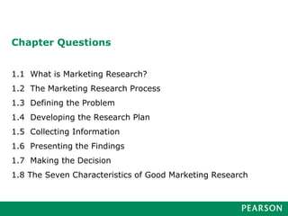Marketing research involves a 6-step process: 1) defining the problem, 2) developing a research plan, 3) collecting information, 4) analyzing the information, 5) presenting findings, and 6) making a decision. Good marketing research is objective, relevant, accurate, reliable, timely, and accessible. It follows this process and utilizes various research methods and tools to gather and interpret meaningful data to inform business decisions.