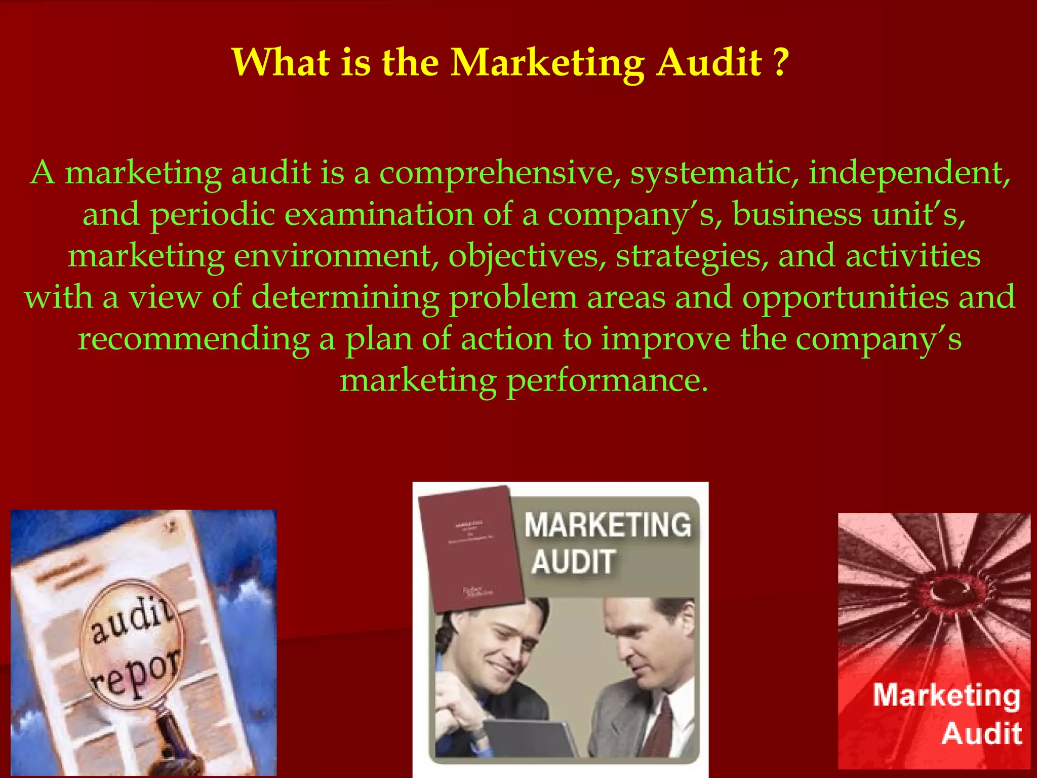 The marketing audit examines a company's marketing environment, objectives, strategies, and activities to identify issues and opportunities for improving performance. The audit follows a three-step process: 1) agreeing on objectives and scope, 2) collecting data, and 3) preparing and presenting a report of findings and recommendations. The audit analyzed the company's automated phone system, message system, and marketing against competitors to develop benchmarked improvements like direct customer surveys and adapting a new customer service approach.