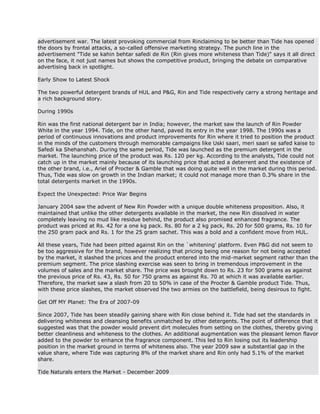 Rin and Tide have engaged in an intense comparative advertising battle in India. Rin recently launched an advertisement directly claiming it provides better whiteness than Tide. This has reignited the debate around comparative advertising. While such advertising aims to inform consumers, it often misleads or discredits competitors. Rin's new ad takes comparative advertising to a new level in India by explicitly naming Tide on television. It remains to be seen if Rin can substantiate its whiteness claims against Tide with evidence.