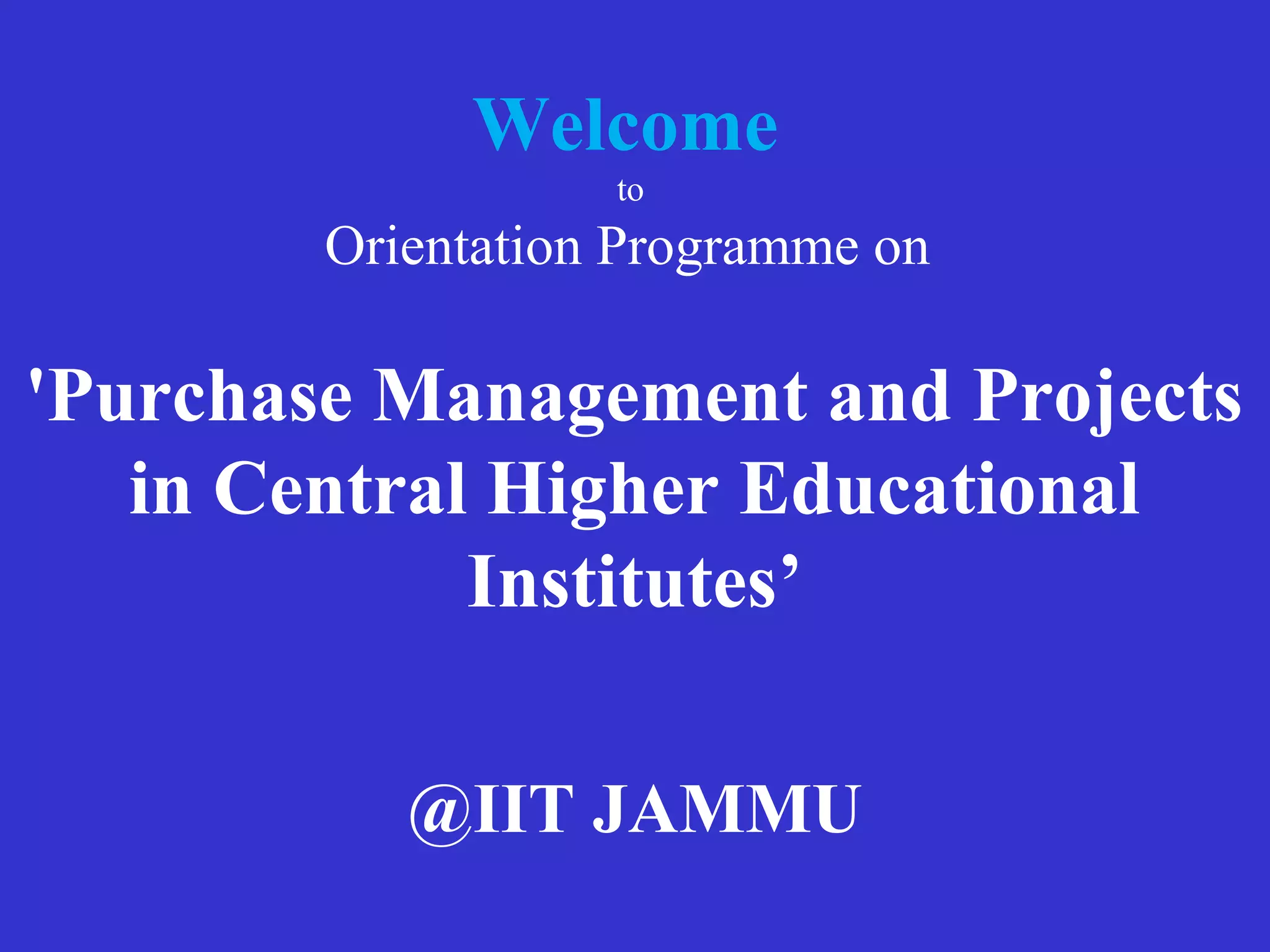 The document provides an overview of a procurement management and projects orientation programme at IIT Jammu. It discusses procurement of items like Aakash tablets, a visit to a national thermal power project, and the expectations of materials management which include end-to-end e-procurement and reverse auctions. It also outlines the different types of purchases, tender processes, import terms, and sections within materials management like dispatch, tendering, local purchasing, imports, and progress tracking.