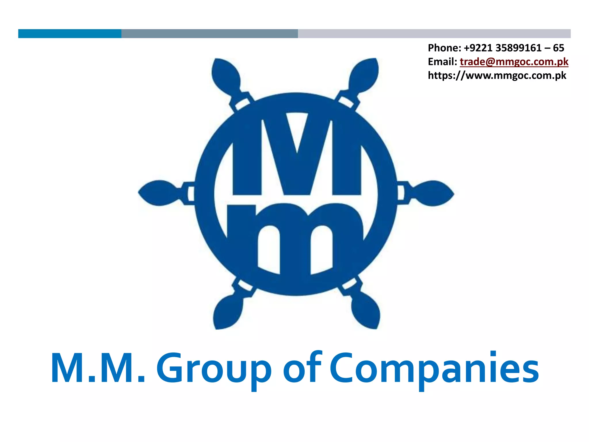 The document provides an overview of the M.M. Group of Companies, a diversified business group established in 1986 in Pakistan. It details the group's various subsidiaries operating in sectors like shipping, logistics, commodities trading, food processing and securities. The group has expanded significantly over 36 years and now consists of 11 companies operating across industries like rice milling, flour milling, edible oil extraction, ghee making and poultry farming. The M.M. Group aims to contribute to Pakistan's growth through knowledge transfer and building strategic partnerships.
