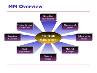 - The document discusses key concepts in materials management in SAP including procurement processes, inventory management, material master data, and material movements.
