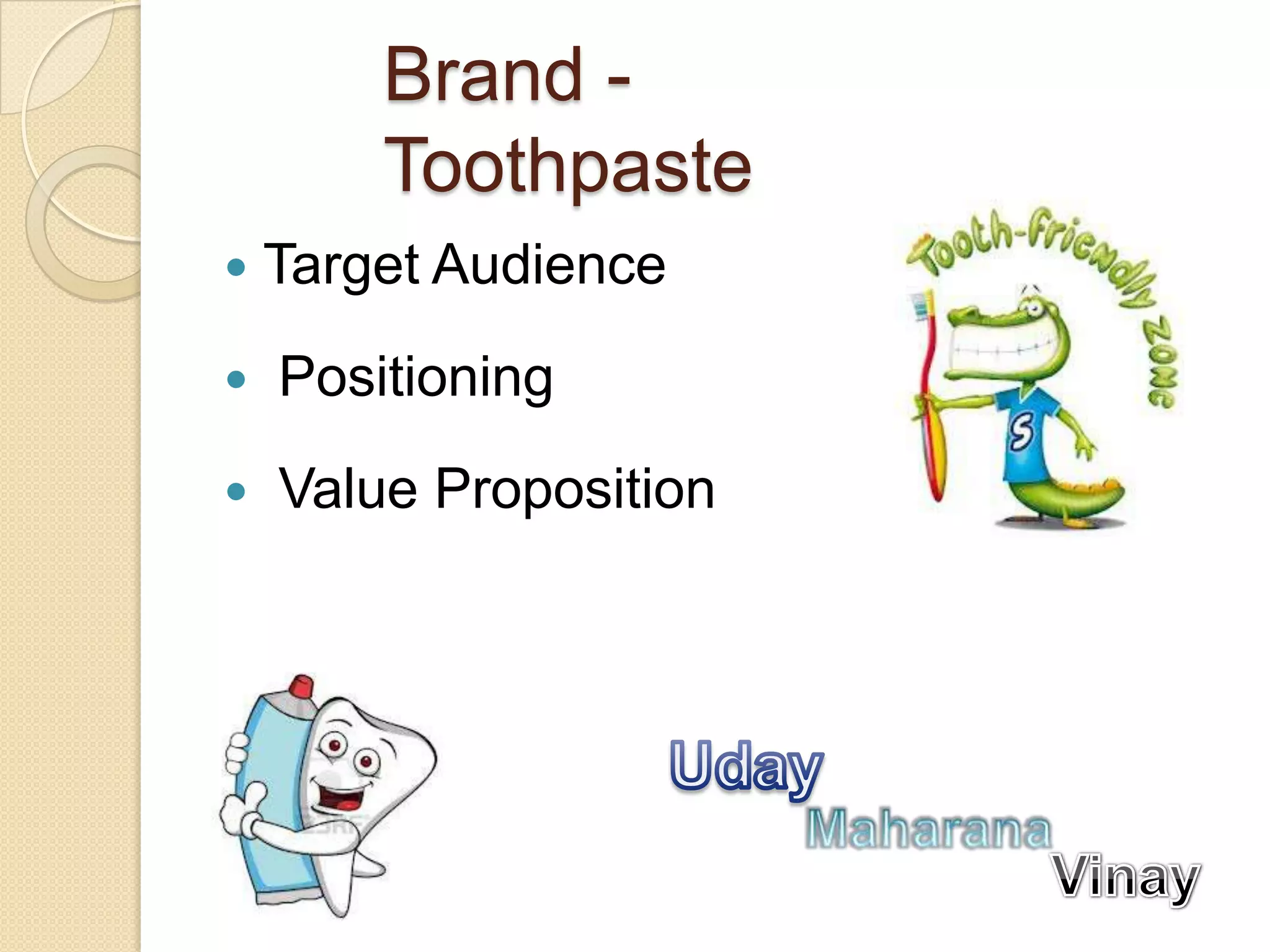 The document discusses the target audiences, positioning, and value propositions of several toothpaste brands: