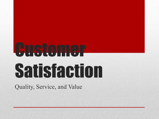 The document discusses customer satisfaction and delivering customer value. It states that satisfied customers will be repeat customers and loyal customers. Customer value is the difference between total customer value and total customer cost, which includes factors like product value, service value, personnel value, and image value, versus monetary price, time cost, and psychic cost. Customer satisfaction is the level of a person's state from comparing a product's perceived performance to their expectations. Companies can deliver customer value through their value chain and core business processes like product development, inventory management, and customer service. Maintaining customers reduces attrition costs and maintaining partnership-level customer relations is most profitable. Total quality management requires that quality be perceived by and reflected in all company activities to continuously improve