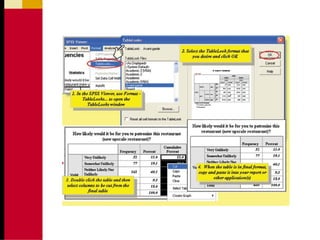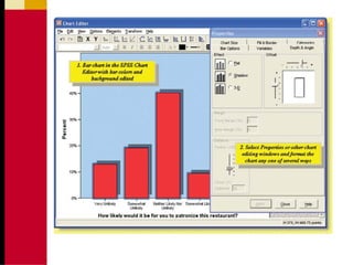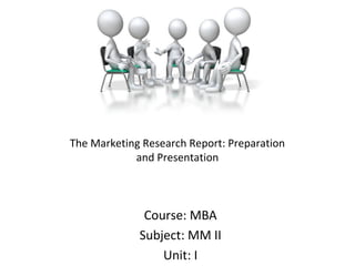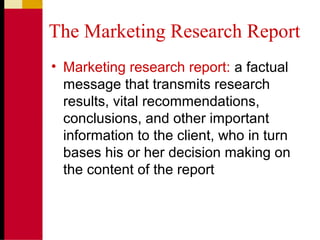 The document discusses best practices for organizing, writing, and presenting a marketing research report. It provides guidance on structuring the report with appropriate headings, formatting the introduction and conclusion/recommendation sections, effectively utilizing visuals like tables and graphs, and tips for an ethical and impactful oral presentation of the findings. The goal is to clearly communicate the research results and insights to the client to inform their decision-making.