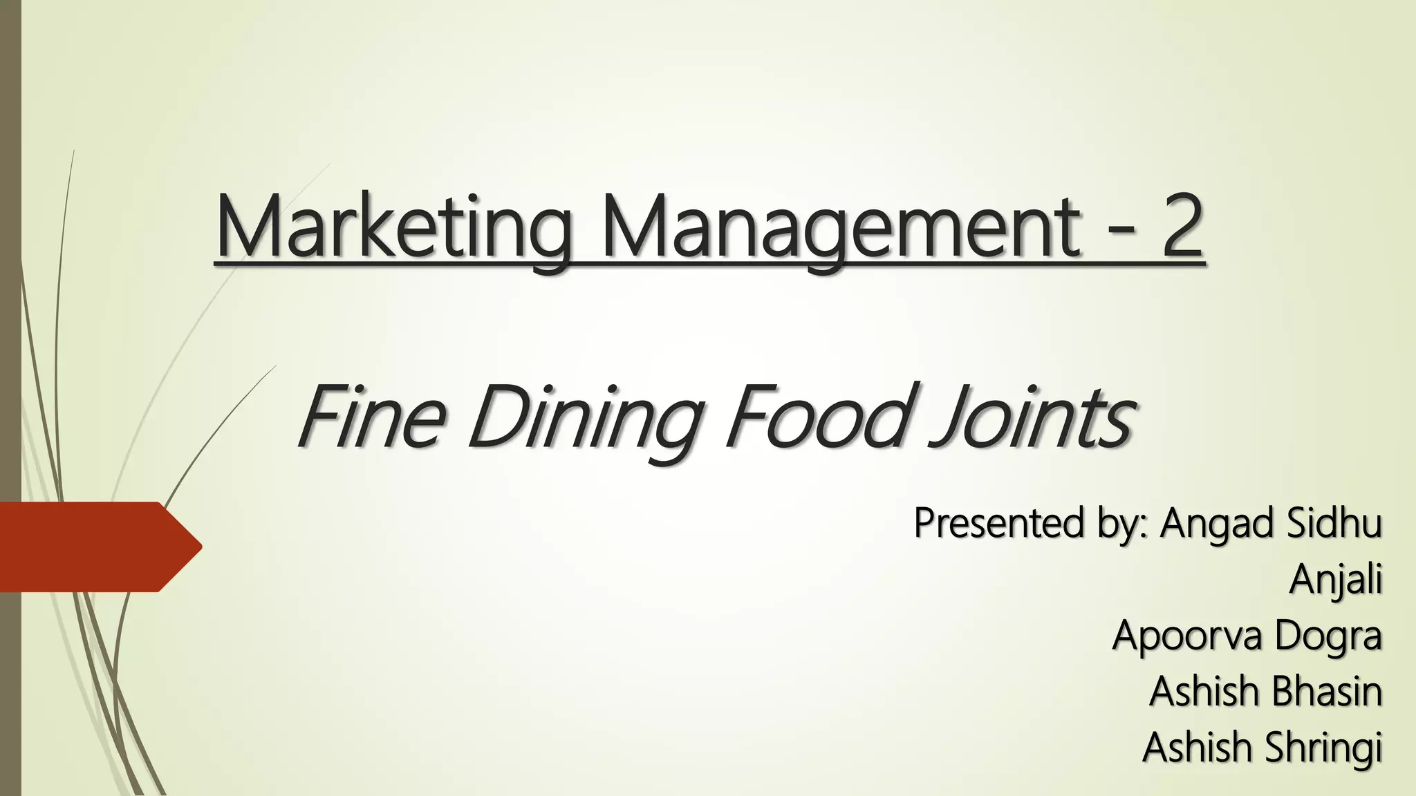 This document summarizes research into consumer behavior and segmentation of customers for fine dining food joints. A study examined factors affecting consumer decisions and customer segmentation. Interviews found most customers are young professionals who dine out weekly, often with friends or family. Social media reviews strongly influence choices. The document recommends joints focus on ambience, service, reviews and location to attract families, offer Italian and North Indian cuisine, and prepare fresh food at night to cater to customers who prefer dining out in the evenings.