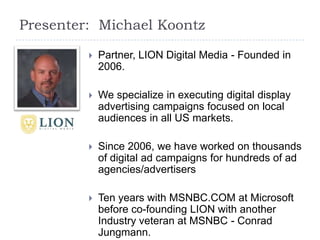 This document discusses online display targeting and summarizes various targeting approaches. It begins by introducing Michael Koontz from LION Digital Media and providing background on the company. It then notes that digital marketing budgets continue growing year over year. The rest of the document summarizes different targeting approaches for online display ads such as site/context targeting, audience targeting using cookies, search retargeting, creative retargeting, audience indexing, behavioral targeting, demographic targeting, and geo-targeting. It emphasizes the importance of setting clear objectives and key performance indicators for campaigns. It also provides recommendations around tracking, testing individual targeting layers, and ensuring strategic execution.