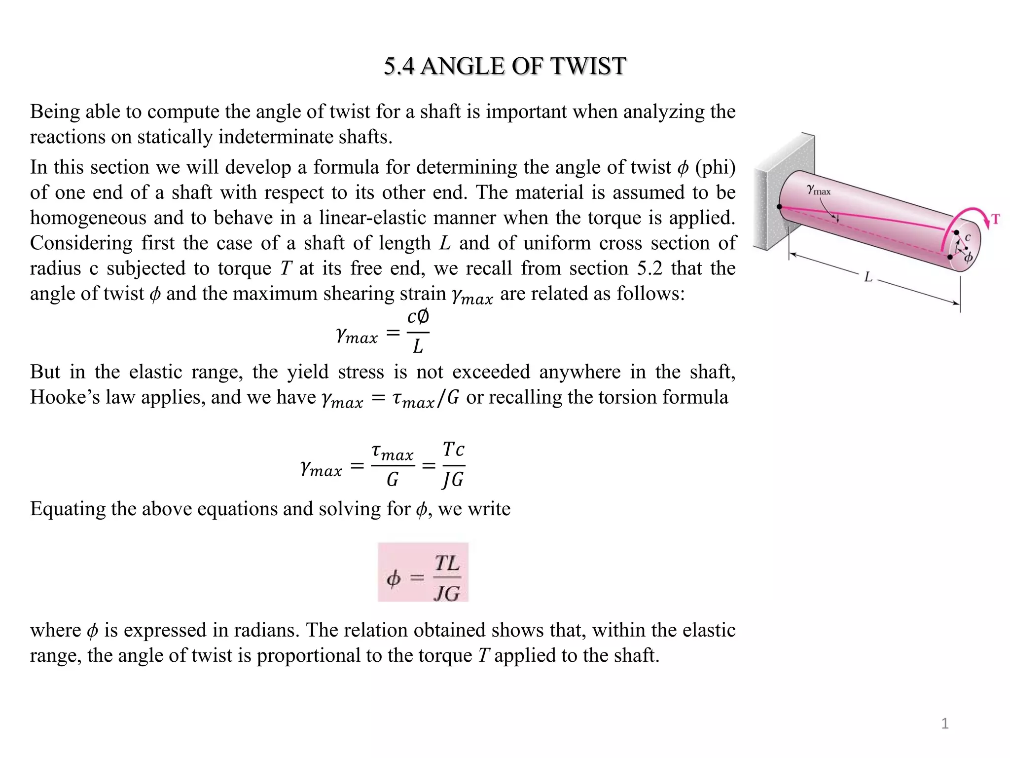 This document discusses determining the angle of twist of shafts subjected to torque. It provides formulas for calculating the angle of twist based on the applied torque, shear modulus, and polar moment of inertia. For shafts with non-uniform cross sections or multiple torques, the total angle of twist is the vector sum of the twist of each segment. Examples are provided to illustrate applying these formulas and determining reactions at supports for statically indeterminate shafts.