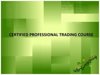 The document provides an overview of various trading courses including professional trading, fundamental analysis, options trading, technical analysis, and forex trading, each with detailed content outlines and durations. It includes course fees, highlights, and intended audience for each program, aiming at enhancing trading skills and market knowledge. There are also mentions of certification programs like CFP, CMT, and courses offered by institutions such as FINRA and FSA, emphasizing the importance of mastery in financial markets.