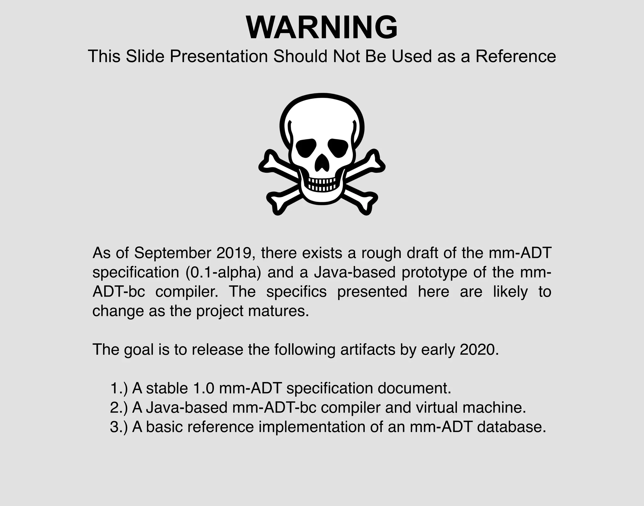 The document describes mm-ADT, a proposed multi-model abstract datatype that aims to provide a universal data structure, processing model, and instruction set that can support various database models like graph, document, relational etc. in a common framework. Key goals are to release a stable mm-ADT specification, compiler and virtual machine, as well as a basic reference implementation by early 2020. The presentation focuses on the universal data structure component, describing how mm-ADT would define custom datatypes, instances, access paths and more using a bytecode language.