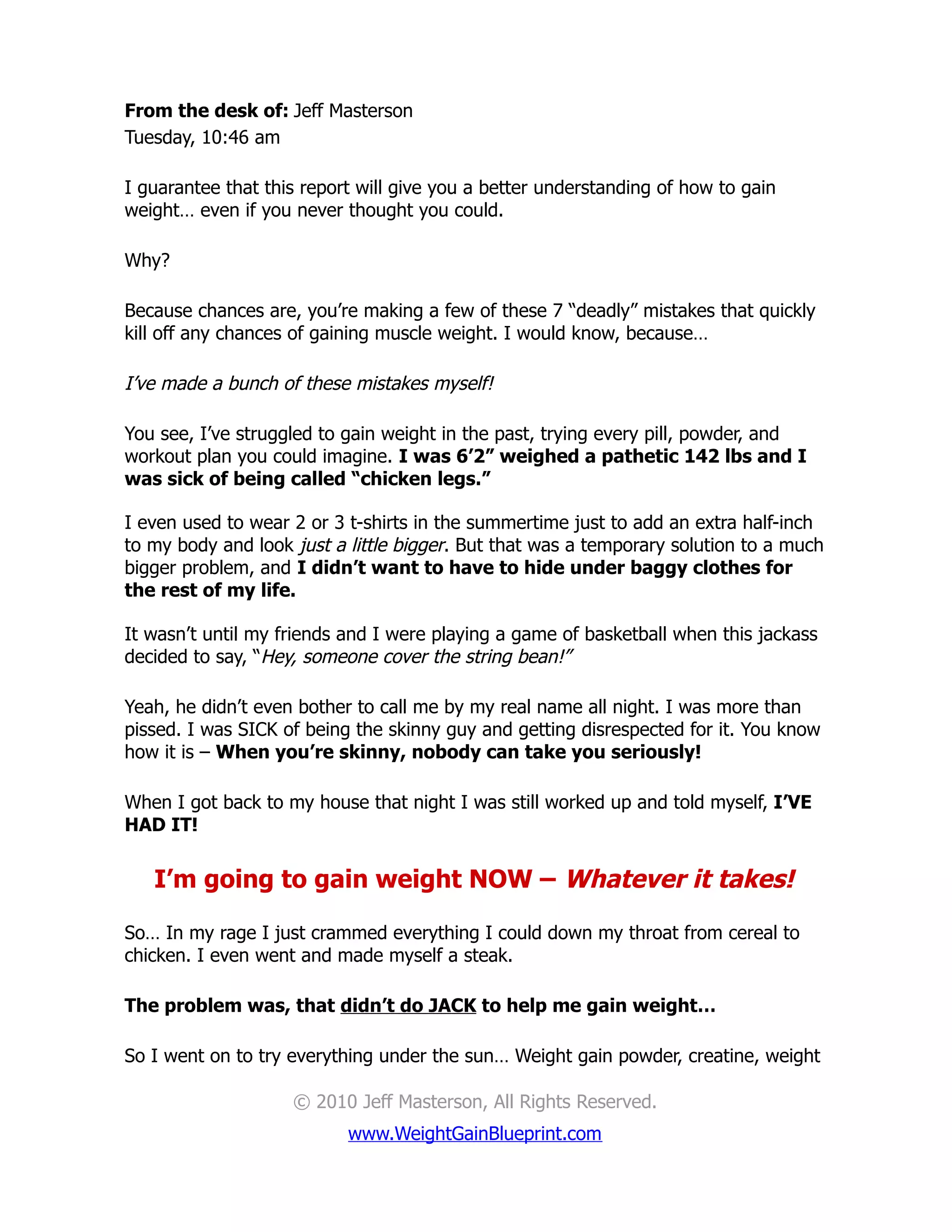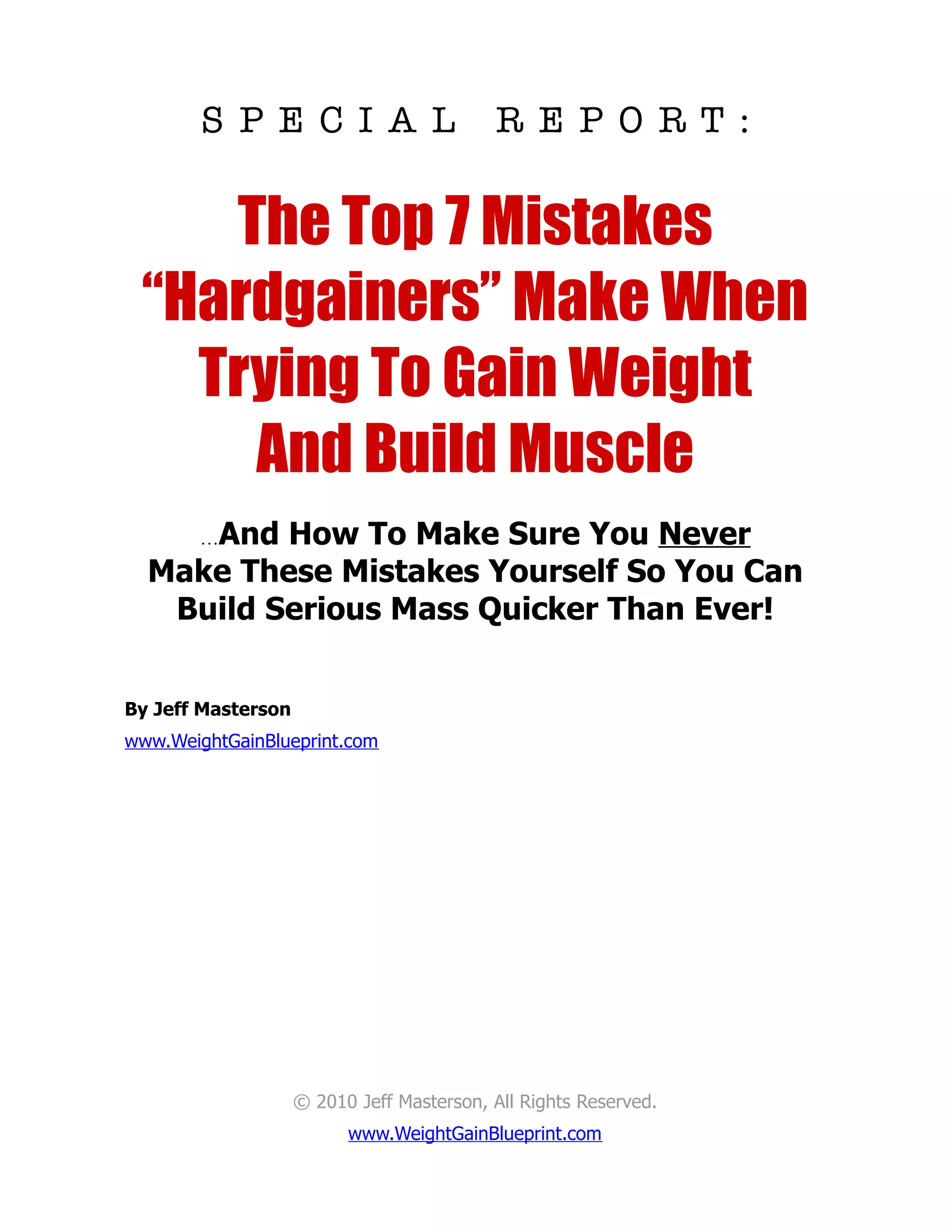 The document summarizes the top 7 mistakes "hardgainers" make when trying to gain weight and build muscle. It discusses overtraining in the gym, not focusing on compound exercises, taking advice from magazines and other sources not tailored for hardgainers, wasting money on supplements, ignoring muscle-building hormones, thinking genetics prevent weight gain, and eating the wrong foods. The author provides strategies to avoid these mistakes and optimize weight gain, such as focusing on compound lifts, boosting testosterone, and eating high-protein and -fat foods.