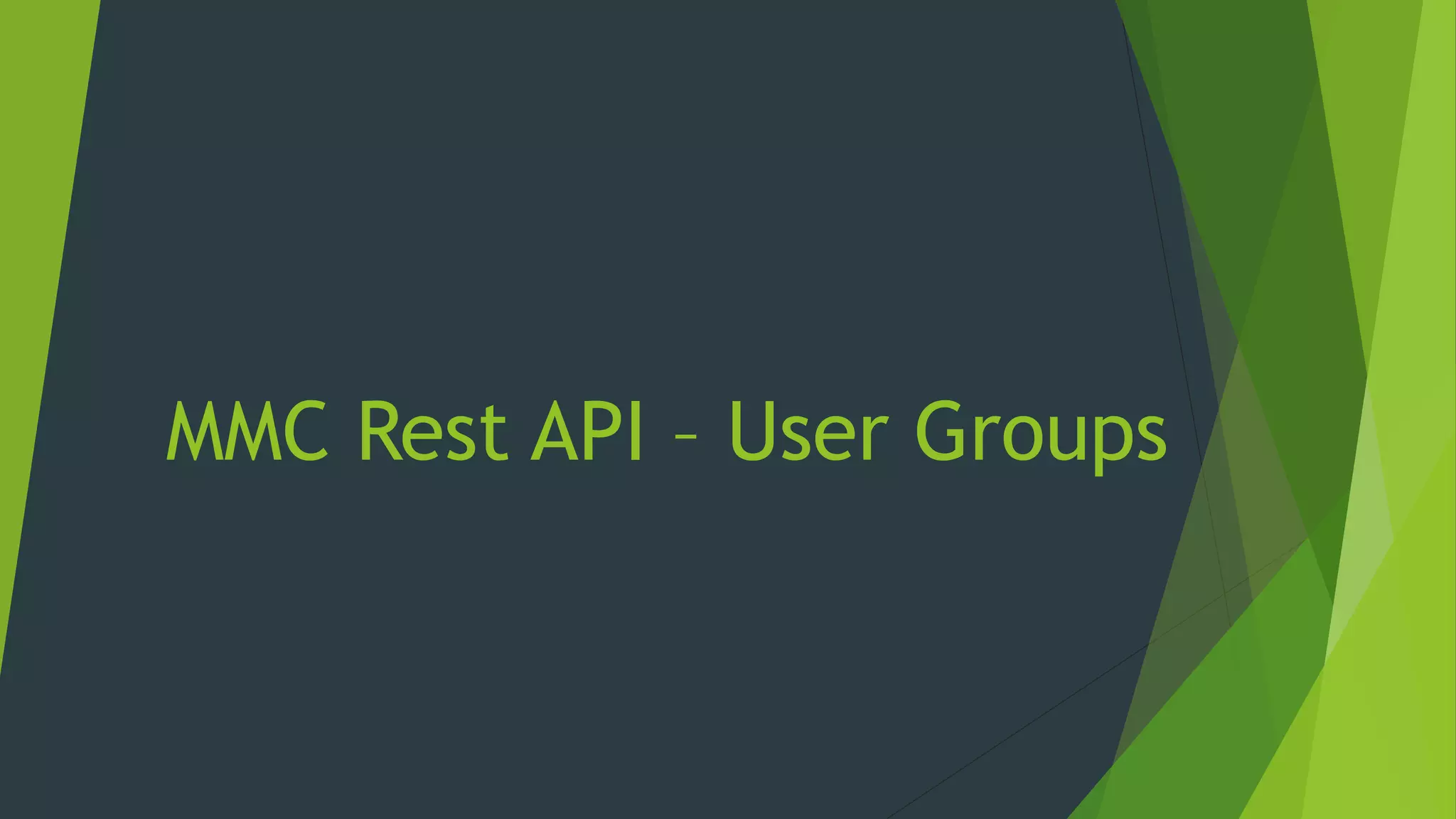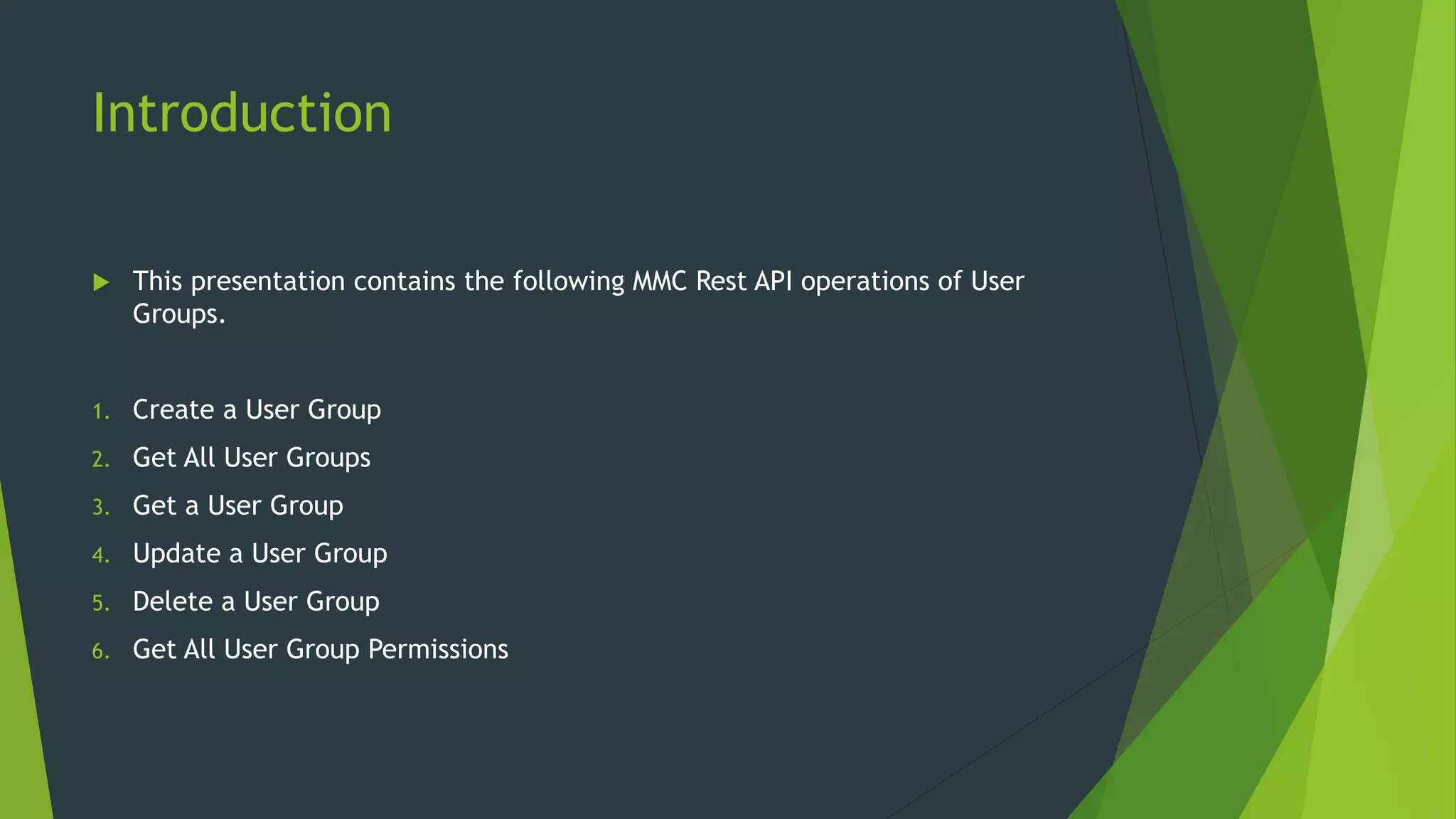 This document outlines the REST API operations for user groups in MMC, including creating, getting, updating, deleting user groups, and getting permissions. It provides the URL, HTTP method, and sample curl commands for each operation: to create a user group a POST request is used, GET is used to get user groups or a specific one, PUT updates a group, DELETE removes a group, and GET also retrieves all permissions.
