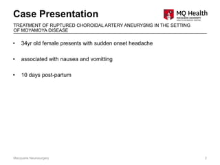 This document summarizes a presentation on treating ruptured choroidal artery aneurysms in patients with Moyamoya disease. It describes a literature search that found 30 relevant cases, most involving posterior choroidal artery aneurysms. Of the patients treated conservatively, two re-hemorrhaged. Among those who underwent treatment, some experienced postoperative deficits, but no significant difference in outcomes was reported between surgical clipping and endovascular coiling approaches. The search was challenging due to the need for multiple search terms and large number of duplicates found across databases.