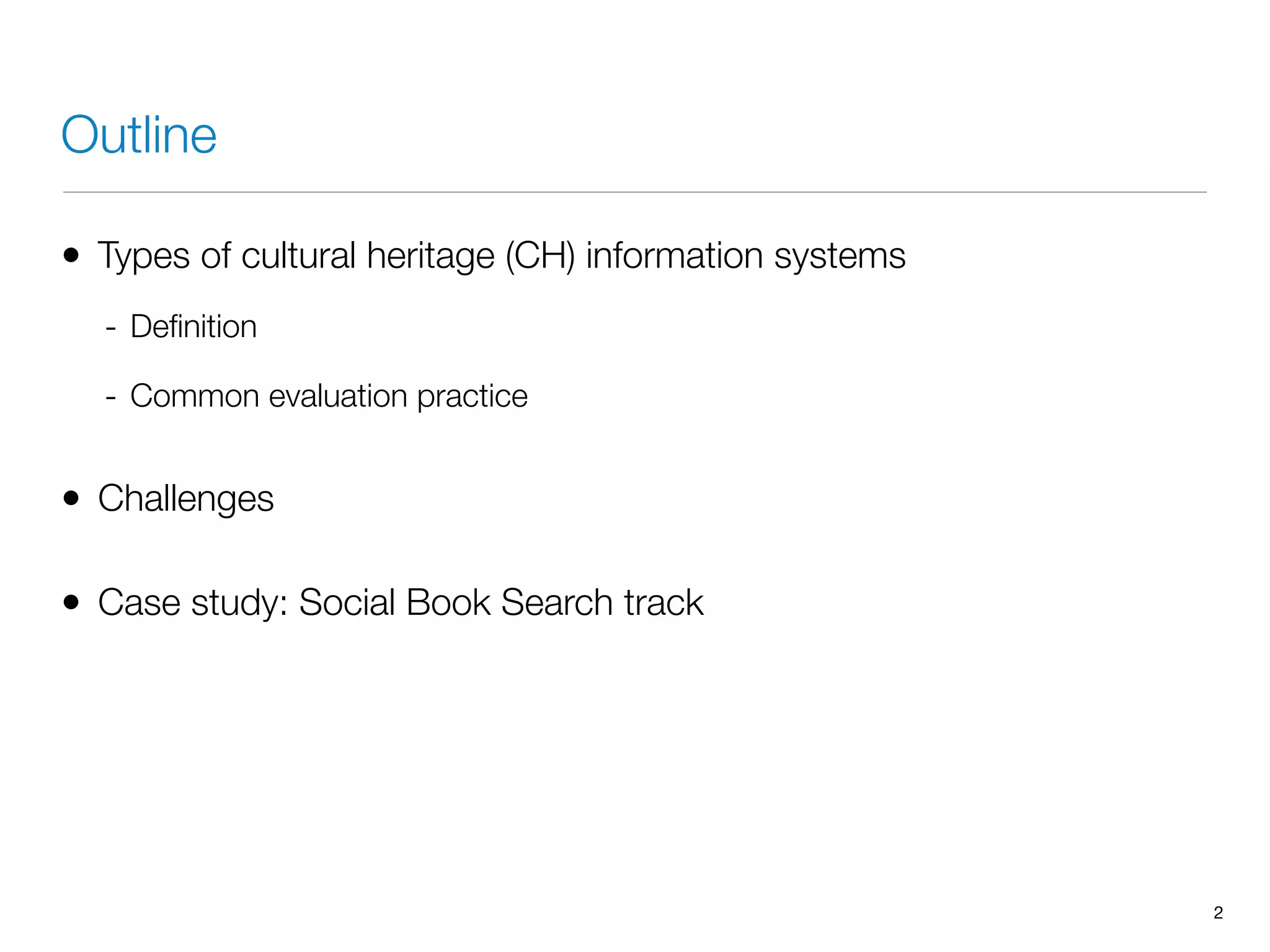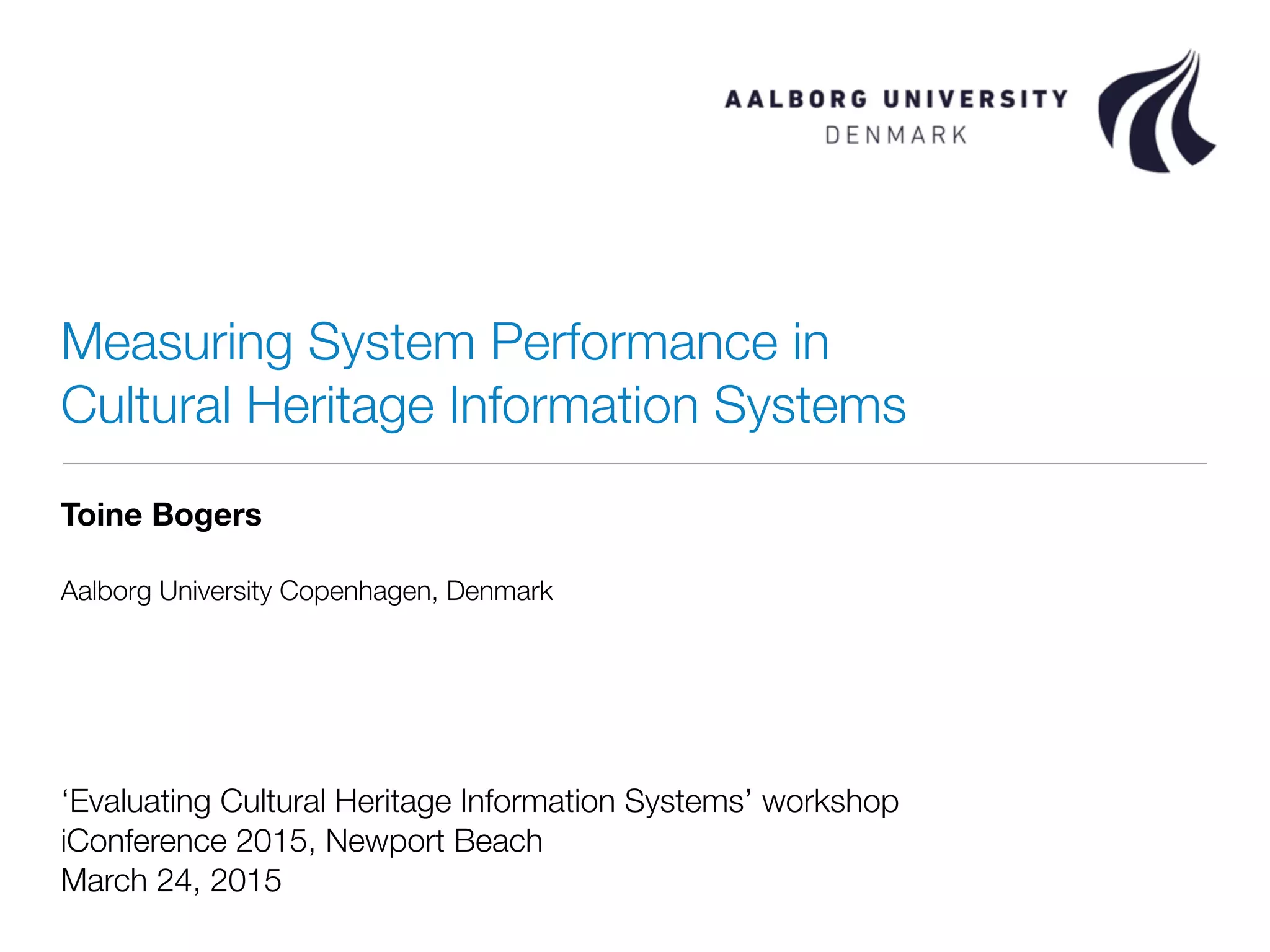 The document discusses measuring system performance in cultural heritage information systems, detailing four main types: search, browsing, recommendation, and enrichment. It outlines evaluation practices and challenges associated with each type, emphasizing the need for realistic data, user input, and tailored evaluation approaches. A case study on social book search illustrates the importance of gathering representative information needs and relevance judgments in the context of cultural heritage.
