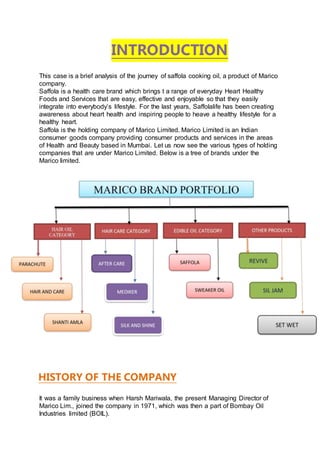 Saffola is a brand of cooking oils owned by Marico Limited that is positioned as heart healthy. It has evolved over time from targeting only heart patients to a broader audience interested in healthy living. Saffola now offers multiple variants including Saffola Gold for a healthy lifestyle, Saffola Active for weight management, Saffola Total for heart health, and Saffola Tasty for family nutrition. Through advertising campaigns and promotions, Saffola aims to inspire small steps toward heart health and fitness.