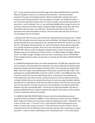 MMM is described as an international, free community where people help each other without bosses or owners. It is not a business, bank, or investment opportunity. Participants can provide or receive assistance from others. There are warnings that you can lose all your money by participating and you are urged not to participate. For those who do participate despite warnings, rules around deposits, bonuses, limits, transfers between participants, and appointing a manager are outlined.