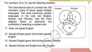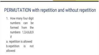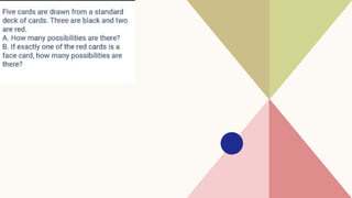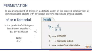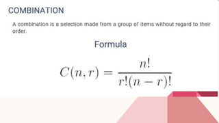 The document covers various topics in probability and counting principles, including the probability of mutually exclusive events and odds. It presents examples and exercises related to selecting outcomes from different scenarios, such as letter combinations and arrangements of students. Additionally, it discusses the fundamental counting principle and various applications of permutations and combinations.