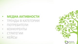 Документ представляет обзор медиаактивностей и рекламных стратегий на фармацевтическом рынке за 2014 год, акцентируя внимание на динамике рекламных инвестиций и росте интернет-рекламы в категории лекарств. Основные выводы включают значительное увеличение рекламных вложений, сезонные колебания в спросе и предпочтения пользователей в выборе каналов коммуникации. Развитие e-commerce для фармацевтических компаний также подчеркивается как ключевой тренд, с акцентом на интеграцию цифровых технологий и стратегий взаимодействия с потребителями.
