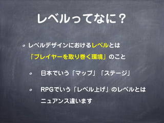 Aiming Inc. 社内で行われたレベルデザインに関する勉強会のスライドです。使用許可の無い画像は削除してあります。ご了承ください。