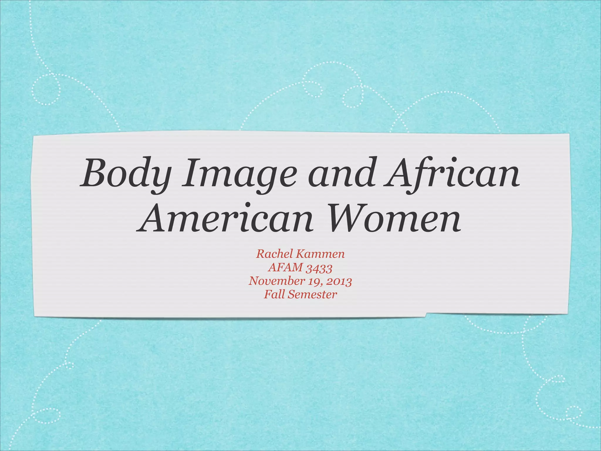 This document discusses body image issues among African American women. It begins by noting that while body image affects people of all backgrounds, research has primarily focused on white women. Several studies are then summarized that examine how African American women's perceptions of their bodies are influenced by factors like their environment, internalization of mainstream beauty standards, and racial identity. The document concludes by emphasizing the importance of promoting positive body image among African American girls and women.