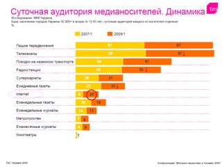 Документ представляет обзор медиа-потребления и рекламы в социальных сетях в Украине на 2009 год. Основные точки фокуса включают тенденции в интернет-рекламе, аудиторию социальных сетей, и важность таргетинга для эффективного медиапланирования. Подробно рассматриваются различные каналы рекламы, динамика потребления медиа и влияние интернета на традиционные СМИ.