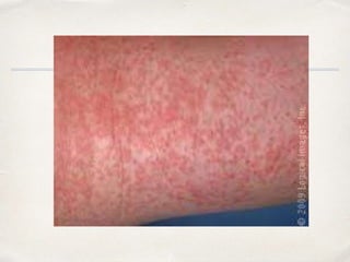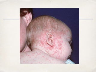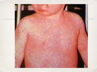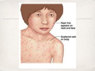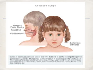 This document discusses measles, mumps, and rubella. It describes how each disease is caused by a virus, spreads through respiratory droplets, and causes specific symptoms. Measles, mumps, and rubella can lead to severe complications and are vaccine-preventable. The MMR vaccine is recommended as a routine childhood immunization at 12-15 months and again at 4-6 years.