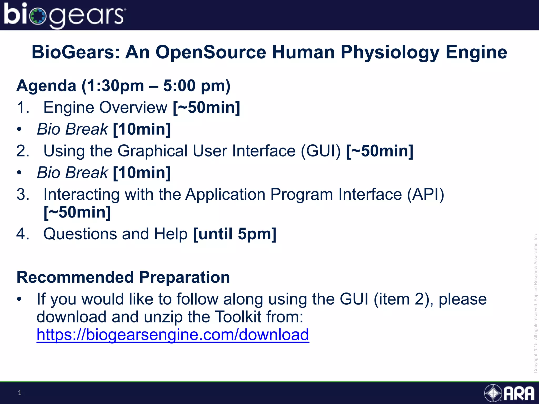 The document presents an overview of BioGears, an open-source human physiology engine designed for medical training and research. It outlines the agenda for a presentation, details on the engine's modeling approach, system architecture, and verification processes, along with milestones and achievements since its inception in 2013. The purpose of BioGears is to create a publicly available platform that supports accurate simulated physiology across various training applications and enhances medical education for military and civilian use.
