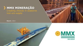 MMX Mineração is a Brazilian iron ore mining company with operations in Minas Gerais and Mato Grosso do Sul states. It has two operating systems, Serra Azul and Corumbá, with a current combined capacity of 7 million tonnes per year. MMX is expanding its flagship Serra Azul project which has over 1 billion tonnes of reserves and will have a capacity of 15 million tonnes per year. It also has its own Porto Sudeste terminal capable of shipping 50 million tonnes annually. 64% of MMX's future production is already committed under long-term contracts with its major shareholders Wisco and SK Networks.
