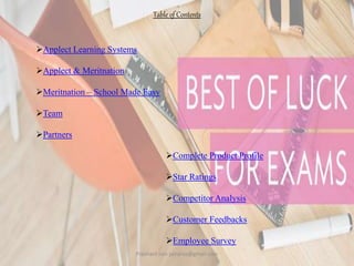 The document discusses Meritnation, an educational initiative of Applect Learning Systems Pvt. Ltd. that provides online and offline learning solutions for students from classes 1-12. It offers study material, tests, videos and other resources for subjects like math, science, English, Hindi and more for CBSE, ICSE and other boards. Customized learning solutions on Meritnation include feedback reports, practice tests and interactive study material to make learning enjoyable.