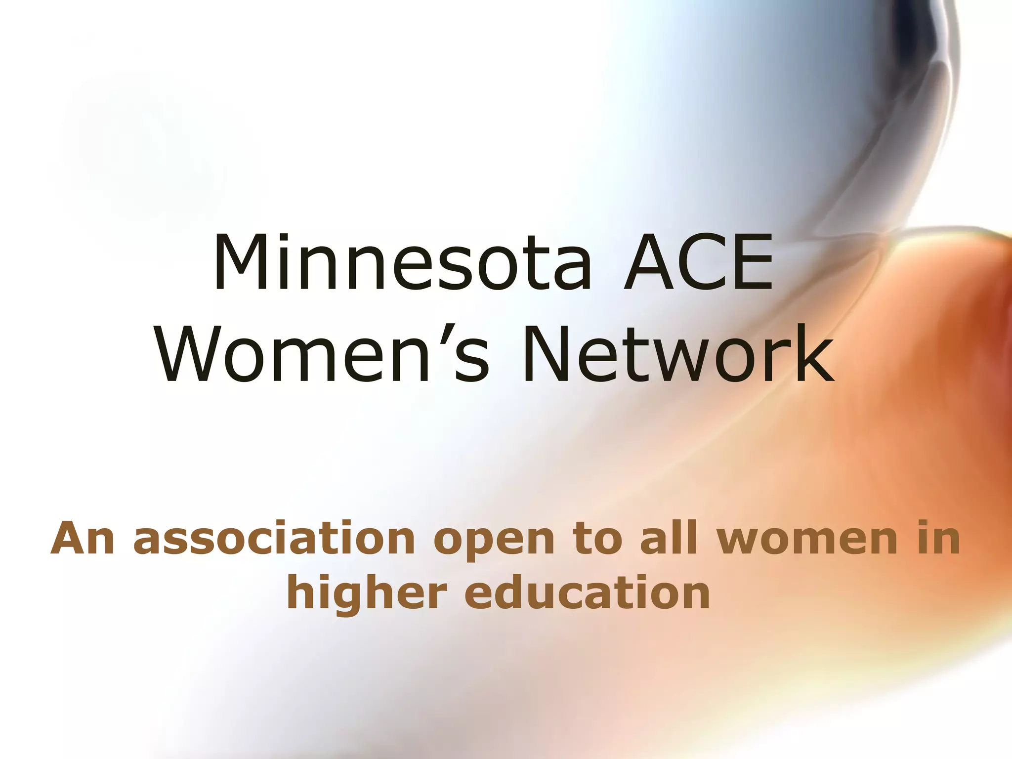 The document summarizes the Minnesota ACE Women's Network, which supports women in leadership positions in higher education. It provides information on its board members, affiliation with the American Council on Education and its programs. It describes the benefits of membership, which include networking, professional development opportunities and updates. Regional conferences are highlighted as opportunities for women leaders to discuss issues in higher education.
