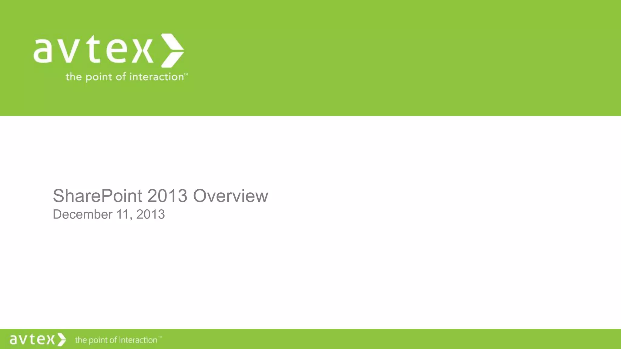 The document provides an overview of SharePoint 2013, including its key features and deployment options. It discusses SharePoint 2013's improved sharing, organizing, discovery, and management capabilities. It also outlines the on-premise and online environment options and describes common deployment scenarios like on-premise, cloud-based, and hybrid configurations. Finally, it shares considerations for migrating from previous versions to SharePoint 2013.