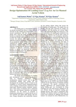 This document discusses the design optimization of landing gear legs for unmanned aerial vehicles, focusing on weight reduction to increase payload. It details structural analyses performed on ASM7075-T6 material using software like ANSYS, covering static and dynamic evaluations under various loads. Additionally, the paper outlines the potential for optimizing landing gear thickness while maintaining structural integrity based on stress analysis results.