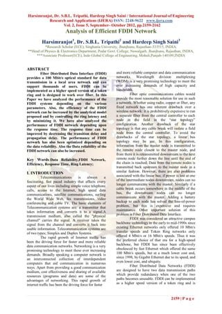 The document discusses the performance analysis of Fiber Distributed Data Interface (FDDI) networks, highlighting its capabilities for high-speed data communication at 100 Mbit/s. It emphasizes the importance of reducing access delays and enhancing data reliability through efficient network configurations. The findings indicate that maximum access delay increases with the number of stations and ring latency, while efficiency declines as latency rises, stressing the need for optimal parameters in network design.
