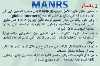 تتناول الوثيقة أهداف وإجراءات مشروع MANRS، الذي يهدف إلى تعزيز الأمن والمرونة في نظام التوجيه العالمي للإنترنت عبر معالجة مشاكل معلومات التوجيه والمساعدة في تنسيق التعاون بين الشبكات. تشمل الإجراءات الموصى بها خطوات لضمان الأمن ومعالجة التهديدات مثل هجمات DDoS، مستندةً إلى أفضل الممارسات الصناعية. يأتي هذا كجزء من الجهود العالمية لتعزيز أمان الإنترنت والحد من المخاطر المرتبطة بالأخطاء في توجيه المعلومات.