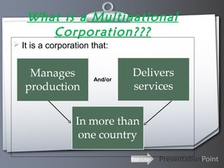 A multinational corporation (MNC) is an enterprise that manages production or delivers services in multiple countries. To be classified as an MNC, a company typically has subsidiaries in foreign countries, operates in many places globally, derives a high proportion of its assets or revenues internationally, and has stakeholders from different home nations. MNCs can have horizontal, vertical, or diversified structures and organize their foreign operations through subsidiaries, joint ventures, franchises, or turnkey projects. While MNCs bring benefits like technology transfer and jobs to host countries, they also face challenges such as potential monopoly power and lack of cultural understanding. Many leading MNCs operate in India due to its large market size, low costs