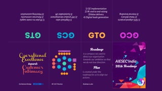 This document outlines AIESEC India's roadmap for 2016, which focuses on operational excellence and customer intimacy. The roadmap includes delivering SDG-aligned projects, value to members, and internal branding. It also details plans for leadership development, including implementing the LEAD model to provide learning environments that develop qualities like empowering others, being solution-oriented, self-awareness, and having a world citizen mindset. A 4-step process is outlined for implementing the LEAD model at the local committee level, including training team members, creating a delivery plan, and tracking progress.